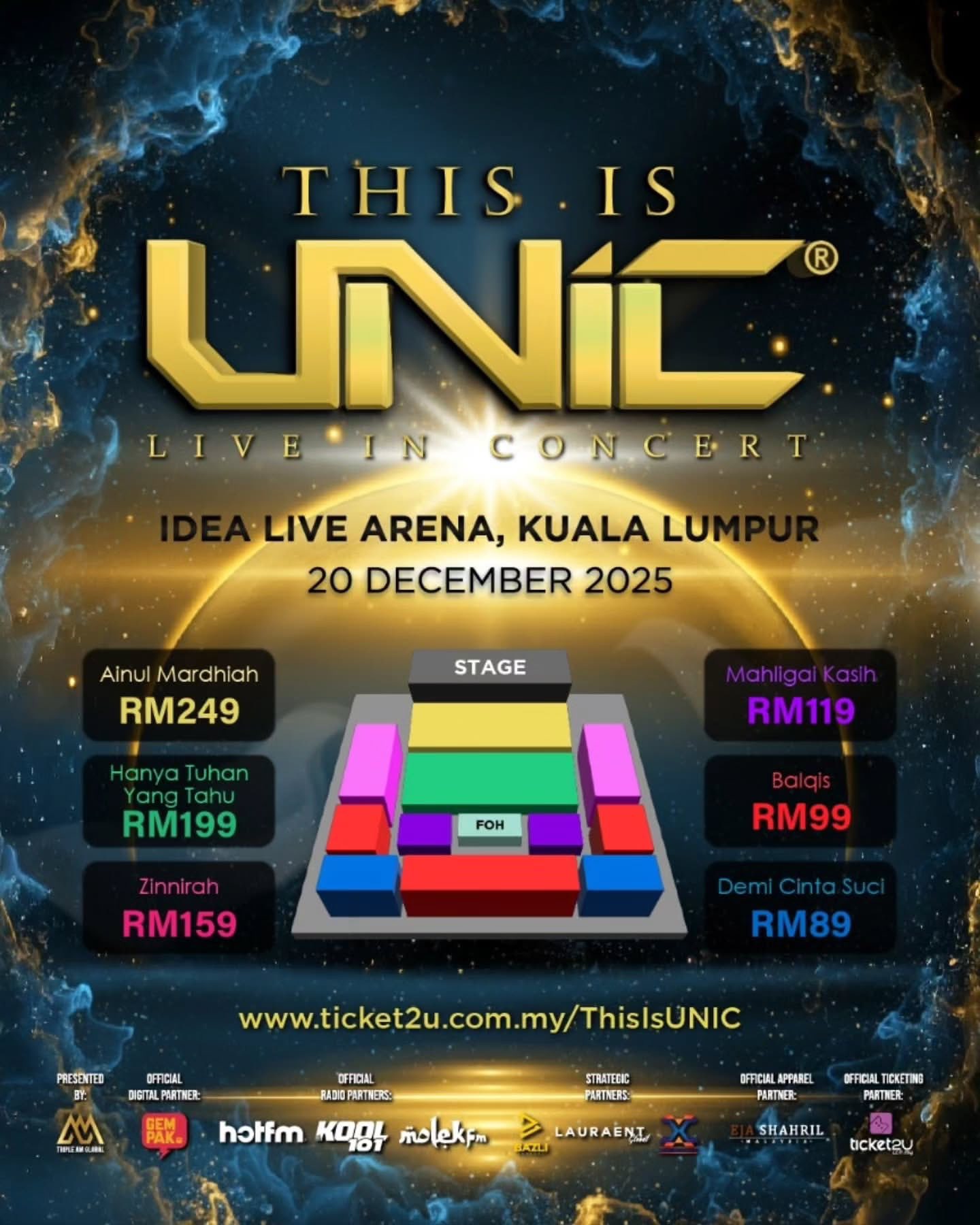 KUALA LUMPUR, 10 Okt – Penantian peminat muzik nasyid tanah air akhirnya terjawab apabila kumpulan nasyid terkenal UNIC, bakal mengadakan konsert istimewa ‘This Is UNIC’ pada 20 Disember ini di Idea Live Arena, dekat sini.